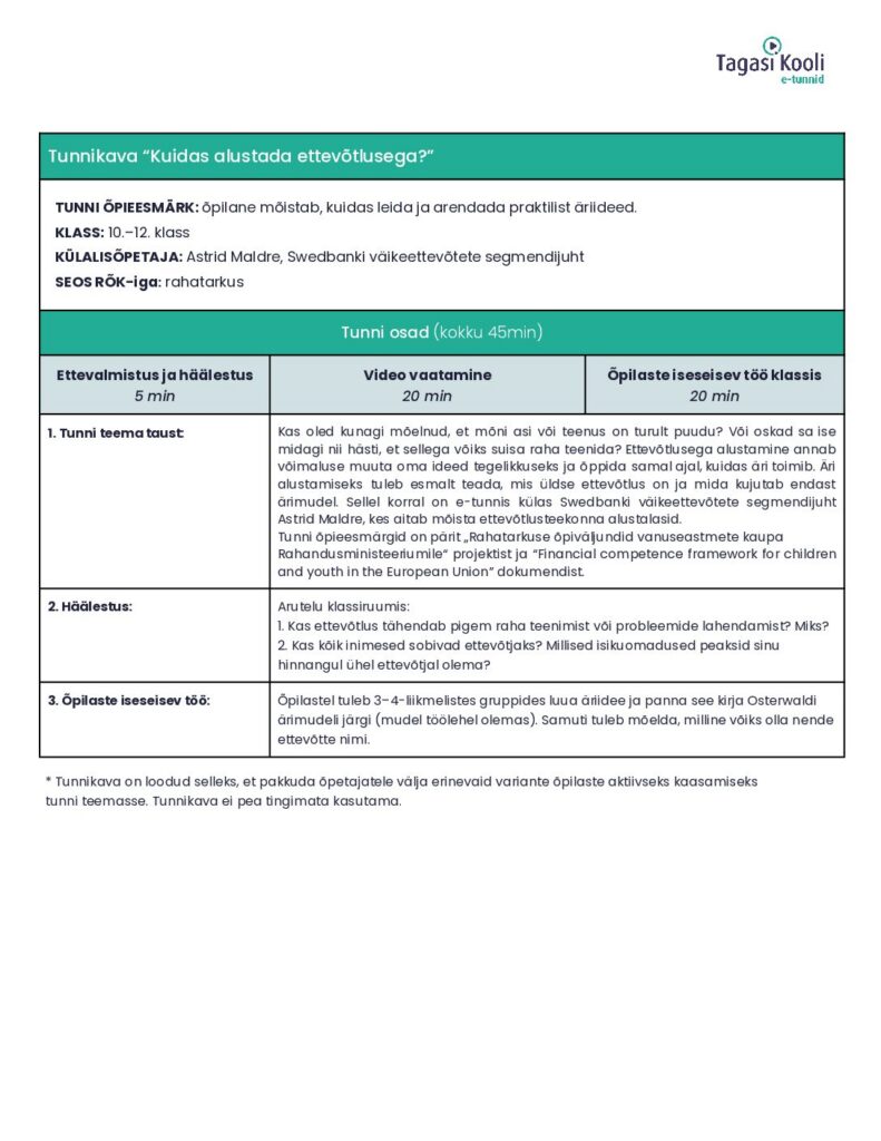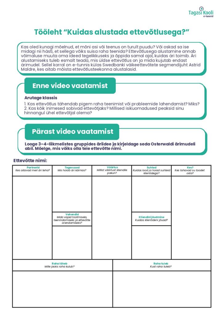 Kas oled kunagi mõelnud, et mõni asi või teenus on turult puudu? Või oskad sa ise midagi nii hästi, et sellega võiks suisa raha teenida? Ettevõtlusega alustamine annab võimaluse muuta oma ideed tegelikkuseks ja õppida samal ajal, kuidas äri toimib. Äri alustamiseks tuleb esmalt teada, mis üldse ettevõtlus on ja mida kujutab endast ärimudel. Sellel korral on e-tunnis külas Swedbanki väikeettevõtete segmendijuht Astrid Maldre, kes aitab mõista ettevõtlusteekonna alustalasid.