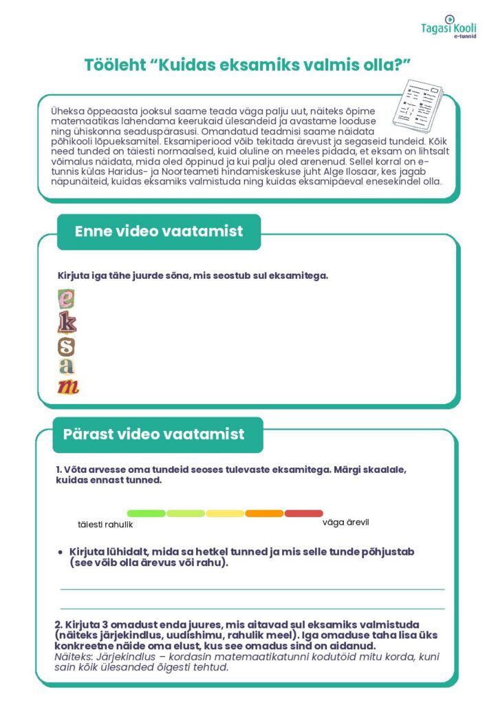 Üheksa õppeaasta jooksul saame teada väga palju uut, näiteks õpime matemaatikas lahendama keerukaid ülesandeid ja avastame looduse ning ühiskonna seaduspärasusi. Omandatud teadmisi saame näidata põhikooli lõpueksamitel. Eksamiperiood võib tekitada ärevust ja segaseid tundeid. Kõik need tunded on täiesti normaalsed, kuid oluline on meeles pidada, et eksam on lihtsalt võimalus näidata, mida oled õppinud ja kui palju oled arenenud. Sellel korral on e-tunnis külas Haridus- ja Noorteameti hindamiskeskuse juht Alge Ilosaar, kes jagab näpunäiteid, kuidas eksamiks valmistuda ning kuidas eksamipäeval enesekindel olla.