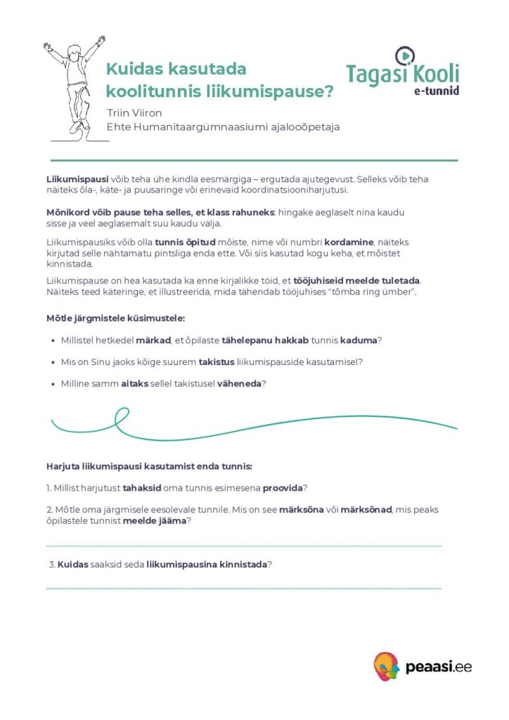 Sellel korral on õpetajatele mõeldud e-tunnis külas Ehte Humanitaargümnaasiumi ajalooõpetaja Triin Viiron, kes räägib, kuidas tema hakkas oma tundides liikumispause kasutama, ning näitab, mil viisil neid enda tundidesse lõimida.