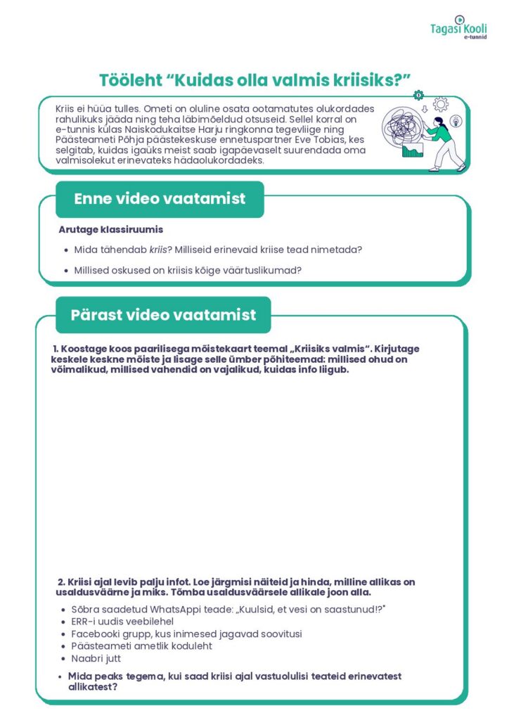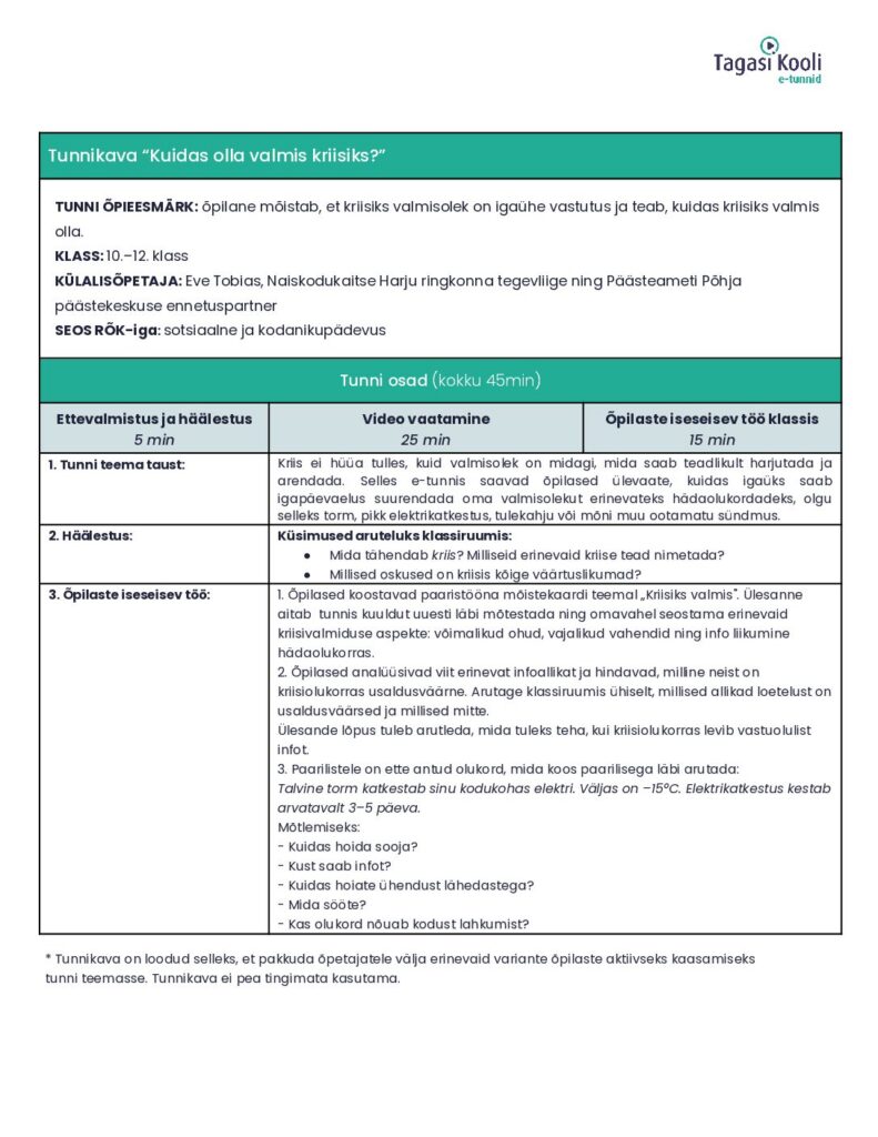 Kriis ei hüüa tulles. Ometi on oluline osata ootamatutes olukordades rahulikuks jääda ning teha läbimõeldud otsuseid. Sellel korral on e-tunnis külas Naiskodukaitse Harju ringkonna tegevliige ning Päästeameti Põhja päästekeskuse ennetuspartner Eve Tobias, kes selgitab, kuidas igaüks meist saab igapäevaselt suurendada oma valmisolekut erinevateks hädaolukordadeks.