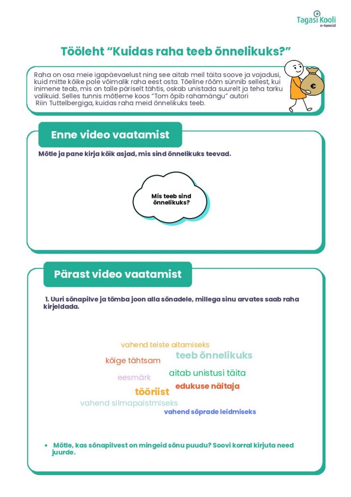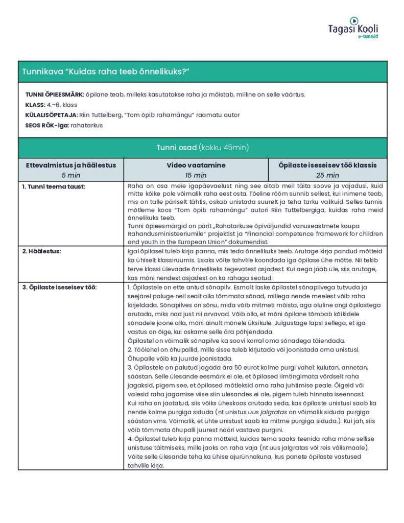 Raha on osa meie igapäevaelust ning see aitab meil täita soove ja vajadusi, kuid mitte kõike pole võimalik raha eest osta. Tõeline rõõm sünnib sellest, kui inimene teab, mis on talle päriselt tähtis, oskab unistada suurelt ja teha tarku valikuid. Selles tunnis mõtleme koos “Tom õpib rahamängu” autori Riin Tuttelbergiga, kuidas raha meid õnnelikuks teeb.