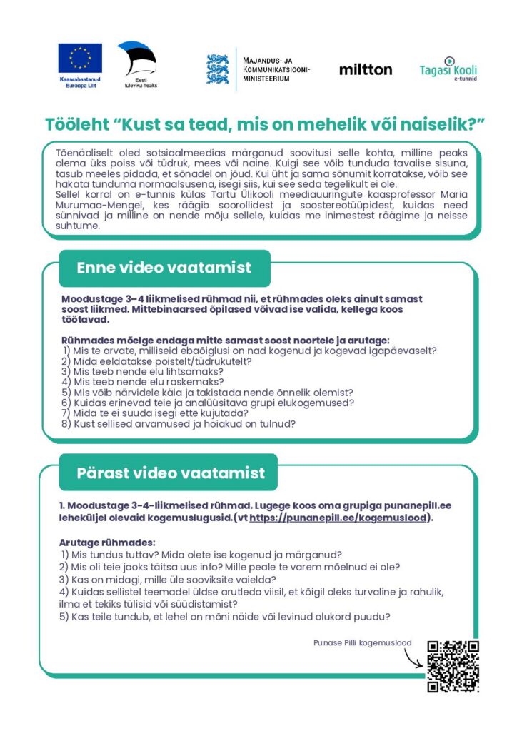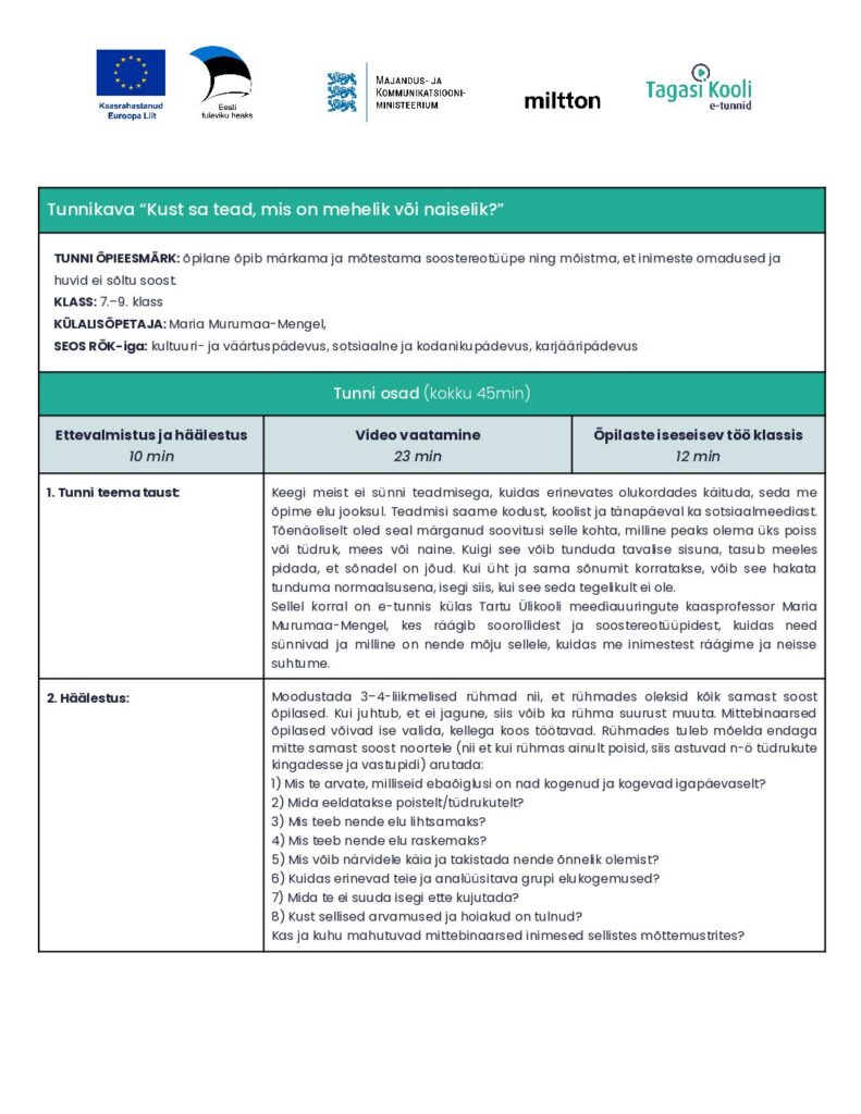 Tund on osa kolmest e-tunnist koosnevast sarjast, mis keskendub sooliste stereotüüpide märkamisele, mõtestamisele ja murdmisele. Vaata ka teisi tunde “Kas mees sobib juhiks?” ja “Kas karjääril on sugu?”.
