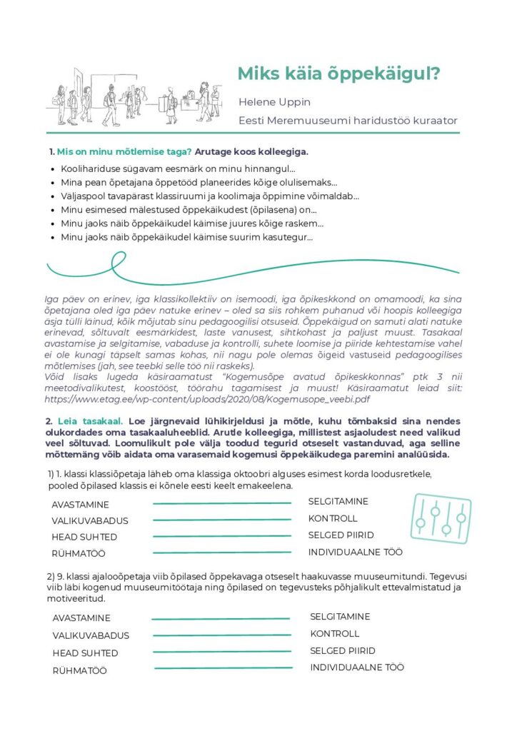 Selles e-tunnis räägib Eesti Meremuuseumi haridustöö kuraator Helene Uppin, kuidas muuta õppekäigud nii õpilastele kui ka õpetajale mõtestatud ja väärtuslikuks kogemuseks: mis kasu saab neist õpilane ja õpetaja ning millised on peamised väljakutsed õppekäikude korraldamisel.