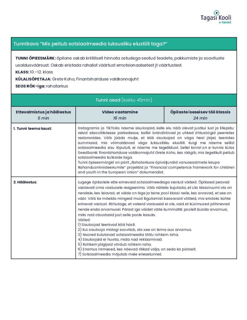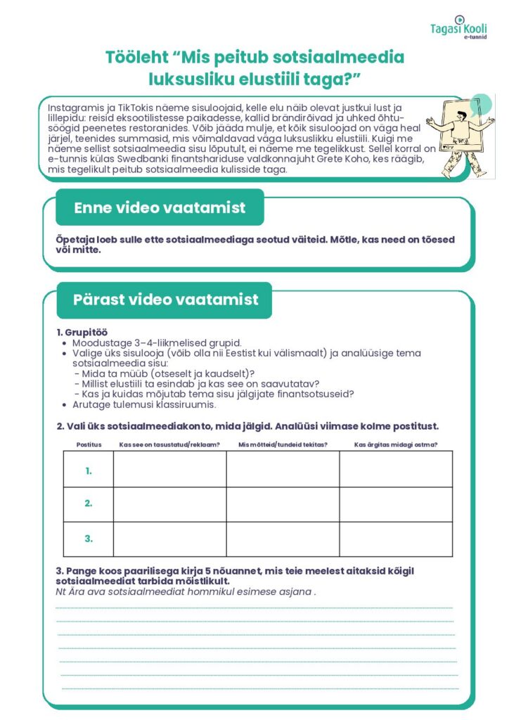Instagramis ja TikTokis näeme sisuloojaid, kelle elu näib olevat justkui lust ja lillepidu: reisid eksootilistesse paikadesse, kallid brändirõivad ja uhked õhtusöögid peenetes restoranides. Võib jääda mulje, et kõik sisuloojad on väga heal järjel, teenides summasid, mis võimaldavad väga luksuslikku elustiili. Kuigi me näeme sellist sotsiaalmeedia sisu lõputult, ei näeme me tegelikkust. Sellel korral on e-tunnis külas Swedbanki finantshariduse valdkonnajuht Grete Koho, kes räägib, mis tegelikult peitub sotsiaalmeedia kulisside taga.