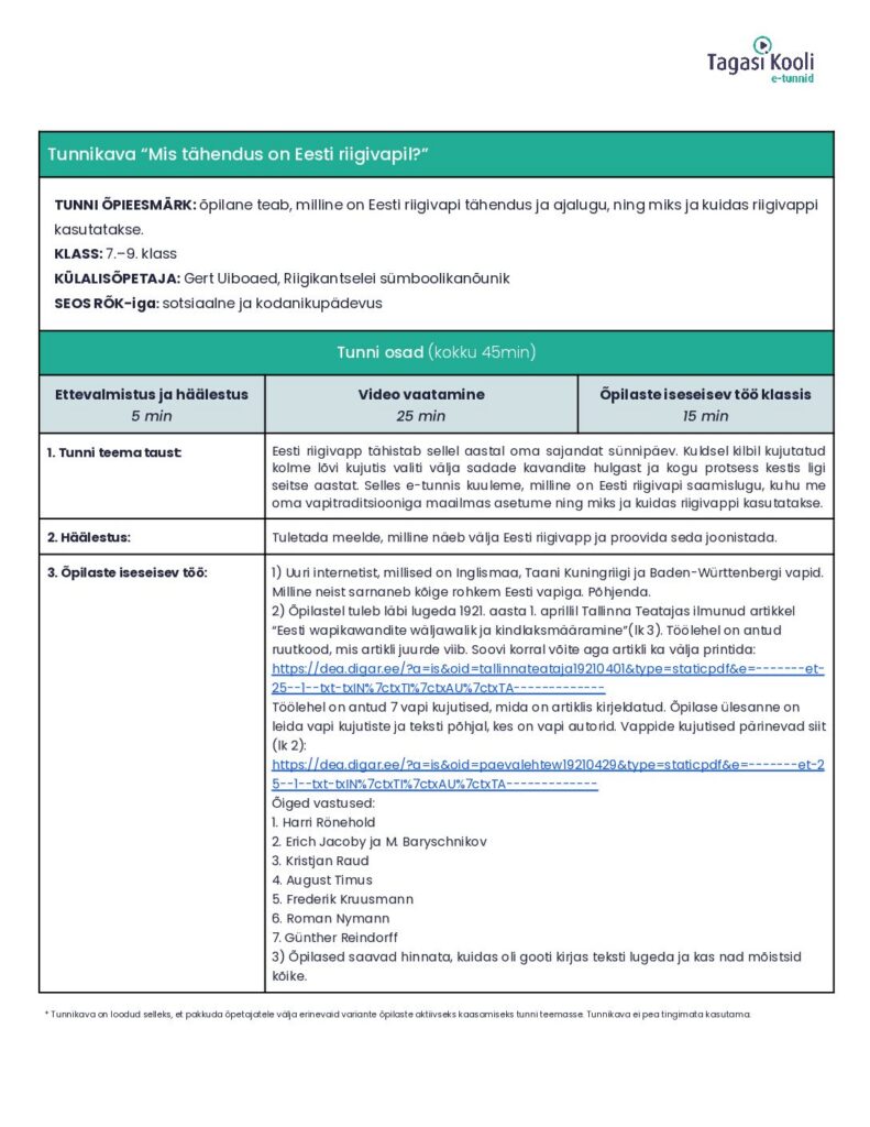 Eesti riigivapp tähistab sellel aastal oma sajandat sünnipäev. Kuldsel kilbil kujutatud kolme lõvi kujutis valiti välja sadade kavandite hulgast ja kogu protsess kestis ligi seitse aastat. Selles e-tunnis kuuleme, milline on Eesti riigivapi saamislugu, kuhu me oma vapitraditsiooniga maailmas asetume ning miks ja kuidas riigivappi kasutatakse.