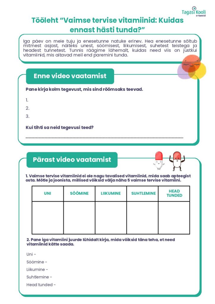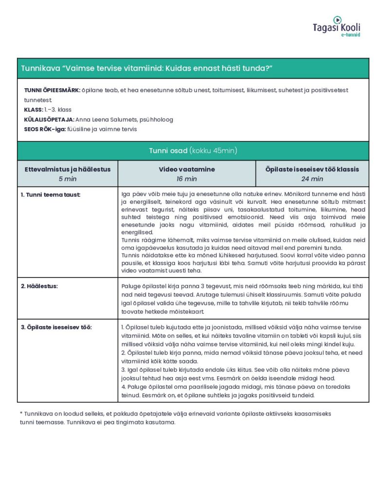 Selles e-tunnis räägib õpilastele vaimse tervise vitamiinidest psühholoog Anna Leena Salumets. Tunnis saame teada, millised viis vitamiini on need, mis aitavad meil ennast hästi tunda ja kuidas neid enda ellu tuua.